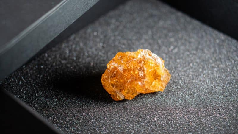 It’s known for its golden, translucent appearance and breakable, glass-like texture..