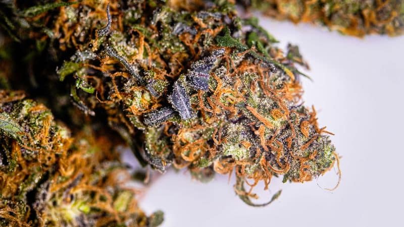 The buds are primarily green, although you may find some with light purple hues. Bright orange thin hairs shoot out of the nugs, adding to the spectacle.