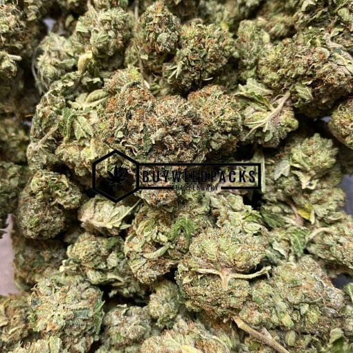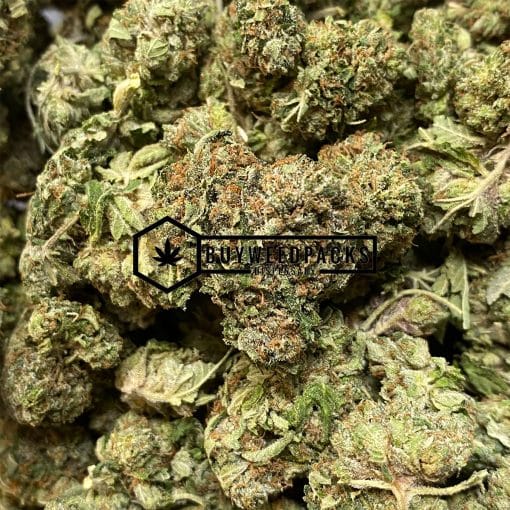 Its visual appeal is unmistakable—oversized, fluffy emerald green buds with deep olive tones, vibrant orange hairs, and a thick frost of glistening white trichomes.