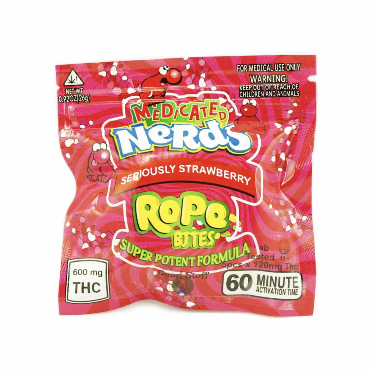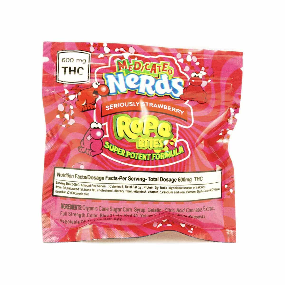 Candy covered-Nerds with a soft, chewy center and infused with 600mg of THC. Every Seriously Strawberry THC Nerds Rope Bites pack contains five sweet bonbon pieces equivalent to a 120mg of THC each.